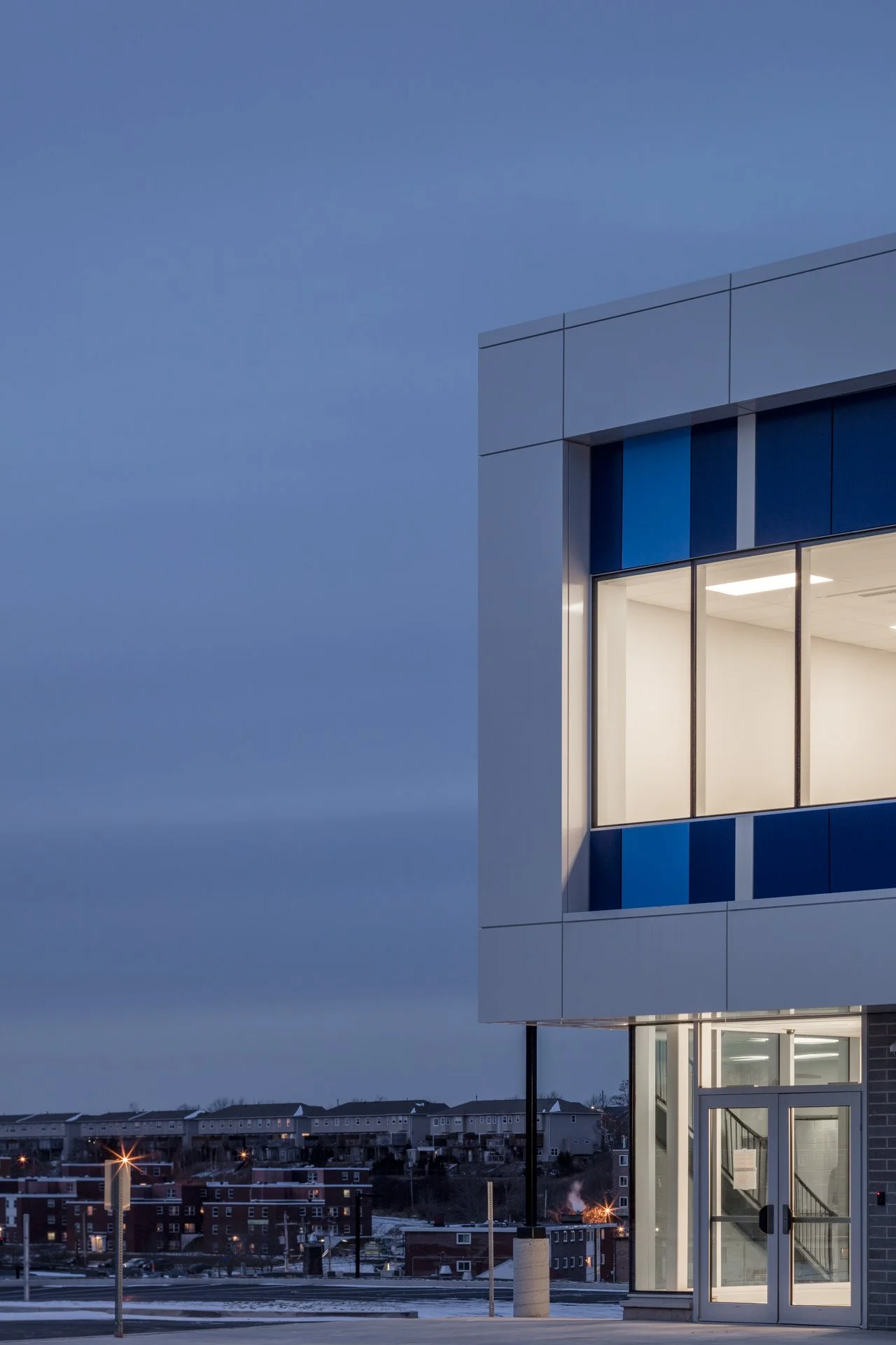 This two-storey, 5 924-square-meter, P-9 school replaced two aging schools in the area. It contains approximately 25 classrooms and can accommodate up to 730 students.