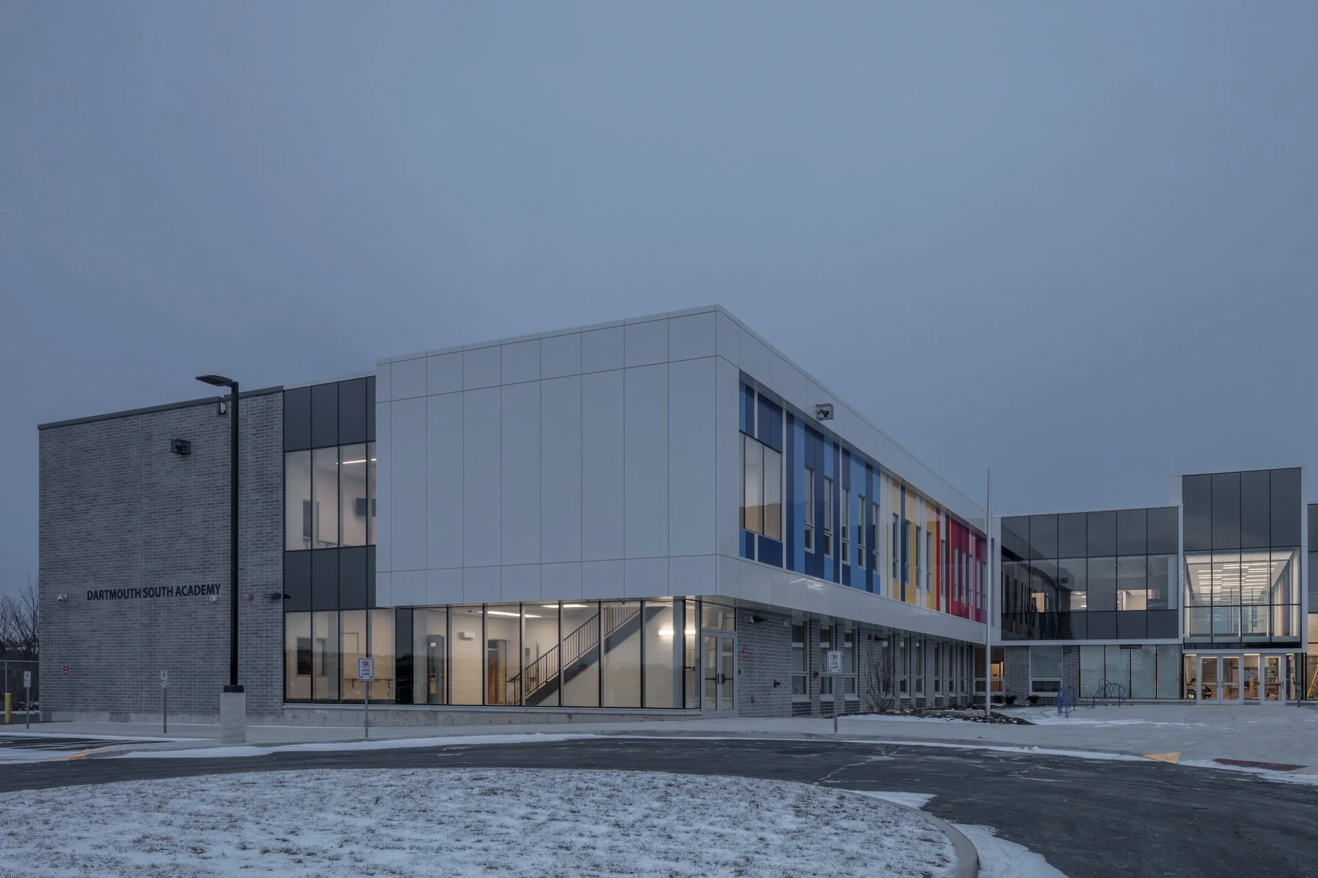 The design incorporates 21st-century learning strategies such as shared learning commons to encourage collaboration and glassed-in group work areas in classrooms. A key feature of the building is the large glassed-in cafeteria which is shared by all students.